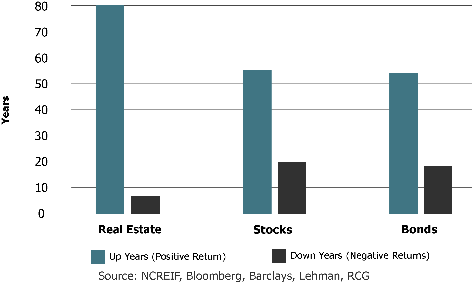 JP Morgan looked at the worst five-year periods for various investments from 1977-2012 and calculated total return (including cash flow). $100 invested in apartments at the beginning of the worst five-year period for real estate was worth $110 at the end. A portfolio of 60% stocks/40% bonds was worth $94 at the end of its worst five years.